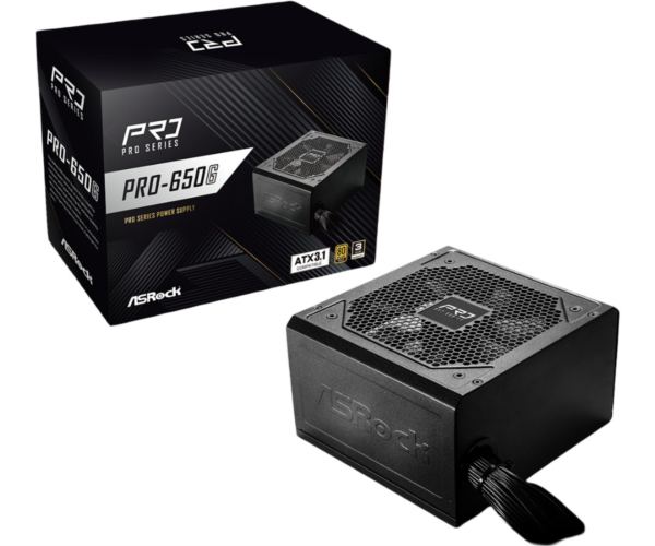 ASRock PSU PRO Series PRO-650G, 650W, 80 Gold – 80 PLUS GOLD Certified ATX3.1 Low noise 120mm FAN Reliable 3-Year Warranty Dimensions(L x W x H) – 140mm x 150mm x 86mm Cable Type: Flat Motherboard cable (24pin): 1x, EPS 12V CPU connectors (4 4pin): 1x, PCIe connectors (6 2pin): 2x, 4-pin Peripheral connectors: 2x, SATA 5-pin connectors: 4x