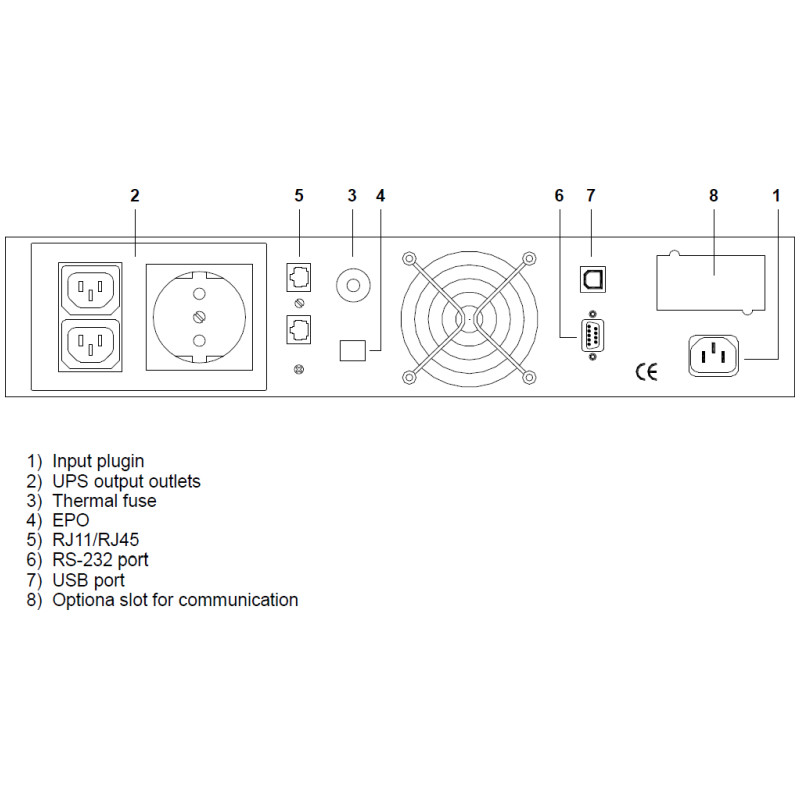 – EPO contact is present by default, too. SNMP card and Realy card are available as option. Input and Output with IEC cables are connected for an easy and quick installation