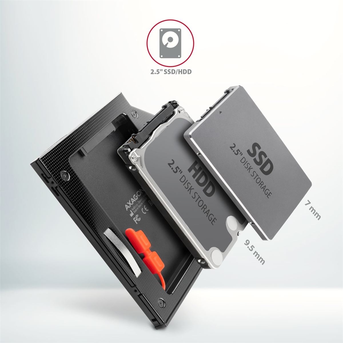 AXAGON RSS-CD09 interni okvir dizajniran je kako bi se ugradio umjesto postojećeg 9,5 mm CD/DVD pogona. Dizajniran je za 2.5″ SSD/HDD SATA diskove. Možete jednostavno zamijeniti optički pogon vašeg laptopa s tvrdim diskom. Može se koristiti standardni 2,5” SSD disk visine 7 mm i tvrdi diskovi visine 9,5 mm. Adapter se s ugrađenim diskovima ponaša kao standardni tvrdi disk u operativnom sustavu i u BIOS-u (UEFI). Umetanjem diska u adapter možete jednostavno dodati interni 2.5″ disk koji može biti dodatak postojećem disku laptopa. Podrška za podizanje sustava može značajno ubrzati starije laptope dodavanjem 2.5″ SSD diska.