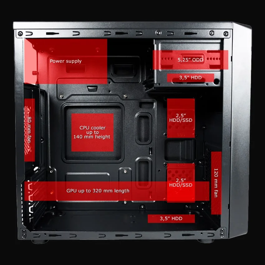 – Ležišta: 1× 5,25″ (vanjsko), 2× 3,5″ (interno), 2× 2,5″ (interno)