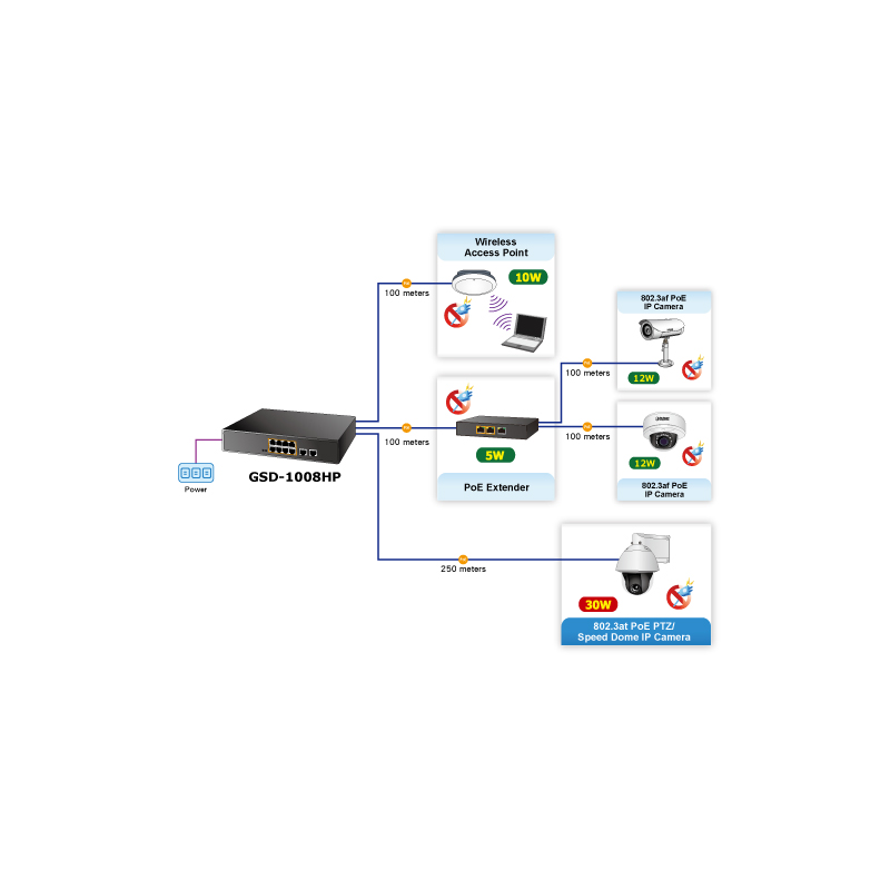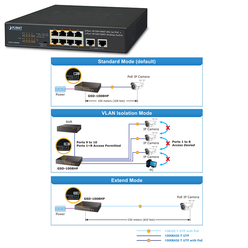 – Hardware DIP switch for Standard, VLAN and Extend mode selection; the Extend mode features 30-watt PoE transmit distance of 250m at speed of 10Mbps and VLAN isolation (Only for Port-1 to Port-8)