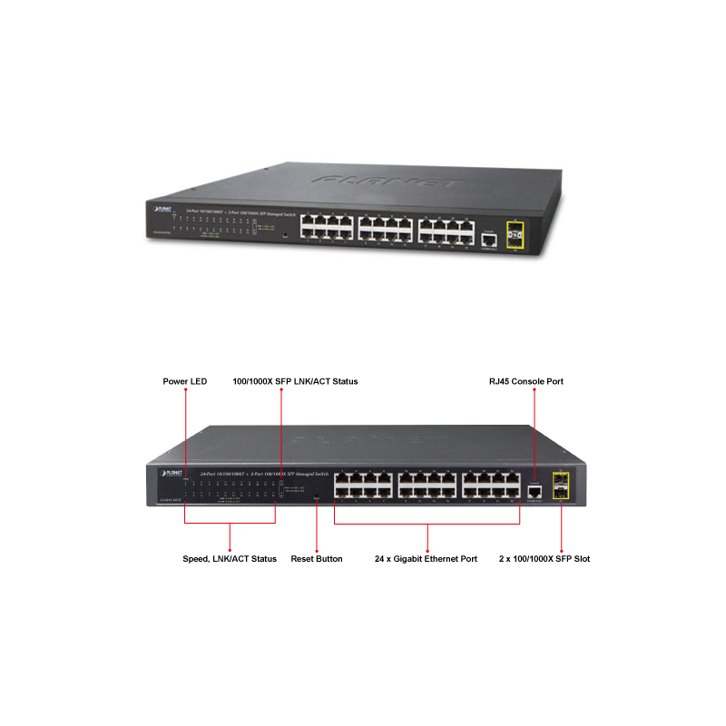 PLANET IPv4/IPv6, 24-Port 10/100/1000Base-T + 2-Port 100/1000MBPS SFP L2/L4 SNMP Manageable Gigabit Ethernet Switch
