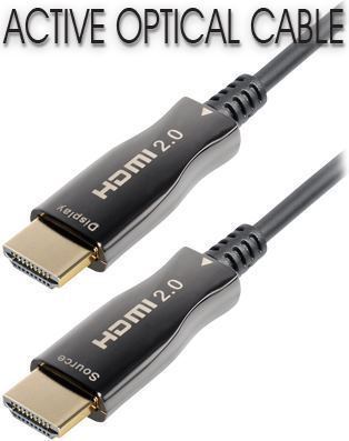 Transmedia C508-20M Active Optical HDMI 2.0 cable, 20m – Supports 4K@60Hz, YUV 4:4:4, 3D, HDR, HDCP 2.2 High-quality, high-gloss metal plugs Gold plated contacts Thin cable, only O 4,5 mm Min. bending radius 15 mm Ultra flexible, easy to install Consists of high-quality multimode fiber optic cables, Innovative digital optical converters integrated in the connectors On spool with colored information print In gift box The cable is unidirectional and therefore may not be connected to the wrong port (screen device). The plug ends are marked Display and Source .