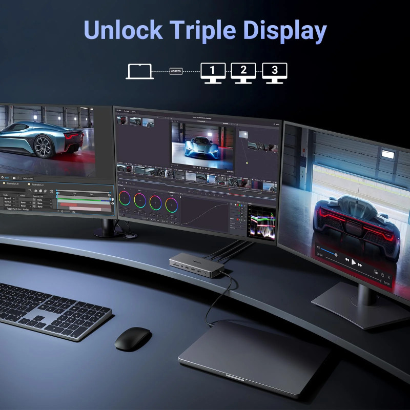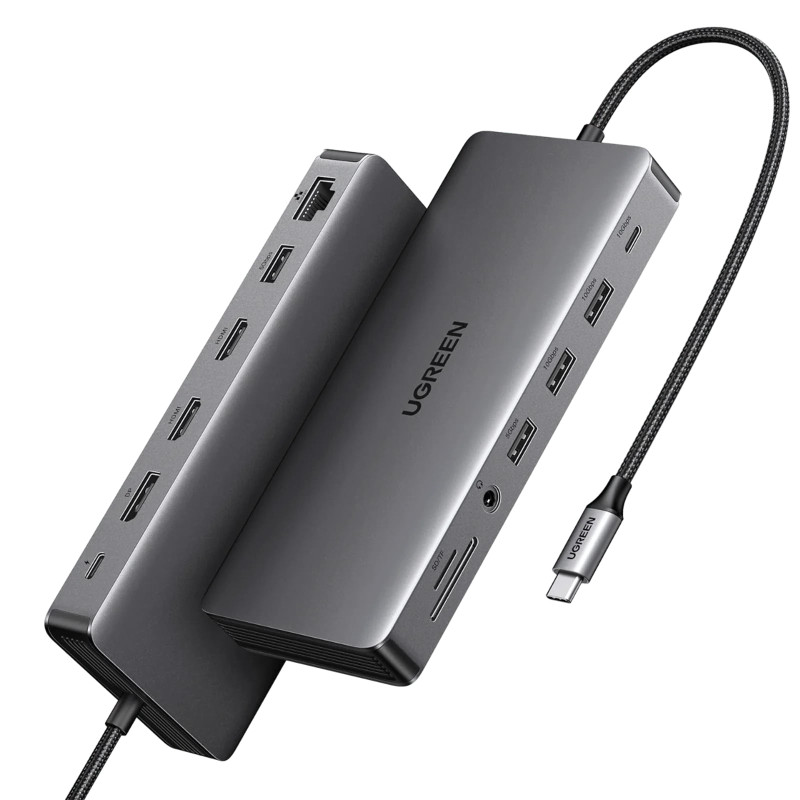 – Svestrano čvorište s dvostrukim HDMI-jem, DisplayPort-om, 100W PD, brzim USB-C i USB-A priključcima, Ethernetom, SD/TF utorima i zvukom.