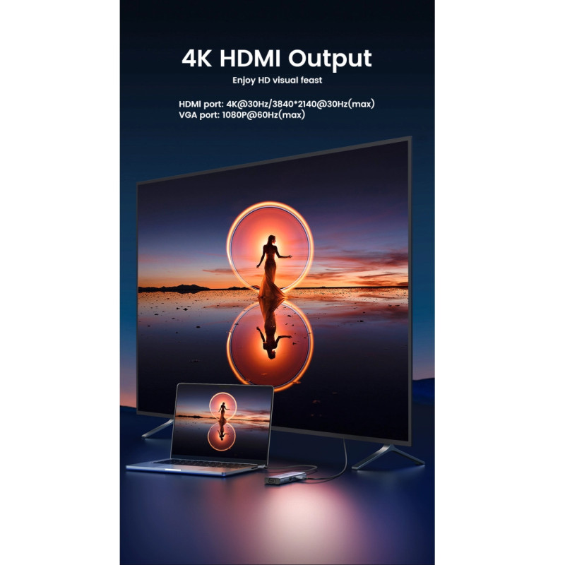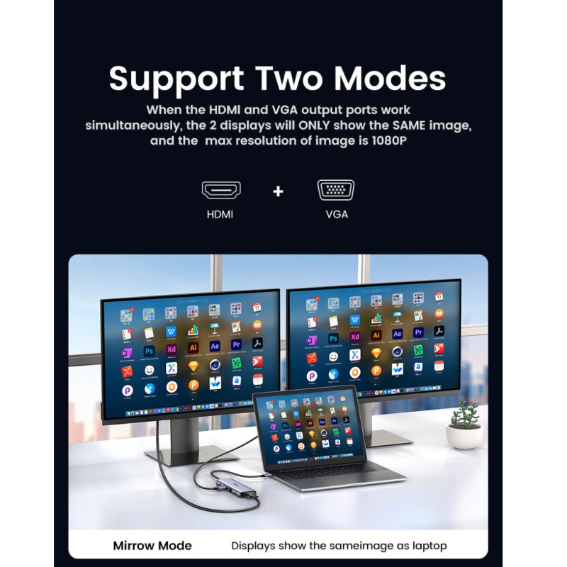 – 4K HDMI i 1080P VGA priključci mogu se istovremeno koristiti za različite uređaje za prikaz poput monitora, TV-a, projektora. Maksimalna izlazna rezolucija doseže 4K 30Hz putem HDMI-ja i 1080P 60Hz putem VGA. Zrcalni način rada AAA i prošireni način rada ABB podržani su i na Macu i Windowsu.