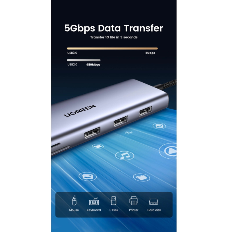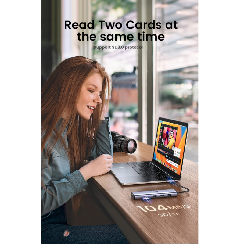 – UGREEN 10 u 1 USB-C hub pruža 4K HDMI i 1080P VGA prošireni priključak za dva monitora, gigabitni Ethernet priključak, USB-C 100W PD priključak za punjenje, 3 USB-A 3.0 priključka, 3,5 mm audio priključak i čitač SD TF kartica. Svi priključci višeportnog adaptera mogu se koristiti istovremeno.